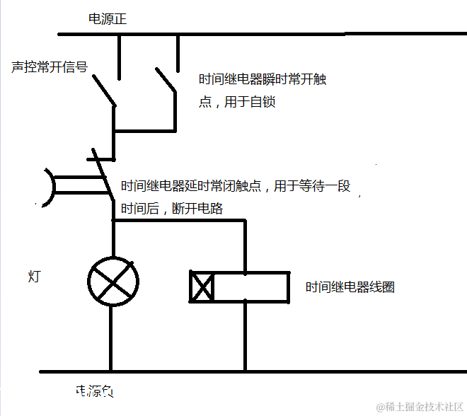 这里的声控开关我们就可以看成一个按钮,启动按钮,只要闭合以此,时间继电器的线圈得电,瞬时常开点立马闭合,达到自锁的目的,过一段时间后,延时常闭断开,相当于停止按钮,断开整个电路,灯熄灭
