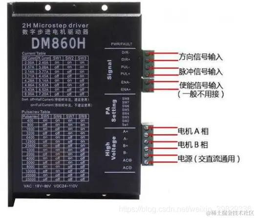 4、步进驱动器一般需要接脉冲信号,方向信号,使能信号一般不接,输出接电机A组,电机B组,调换任意A+和A-或者B+和B-可以调换电机方向,当然从程序内部也可以修改;