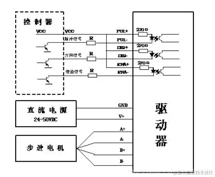 6、根据控制器的输出类型不同,脉冲和方向的接法也不一样,如果控制器是NPN输出,那么P-接脉冲,D-接方向,P+和D+接VCC;如果控制器是PNP输出,那么,P+接脉冲,D+接方向,P-和D-接DC0;