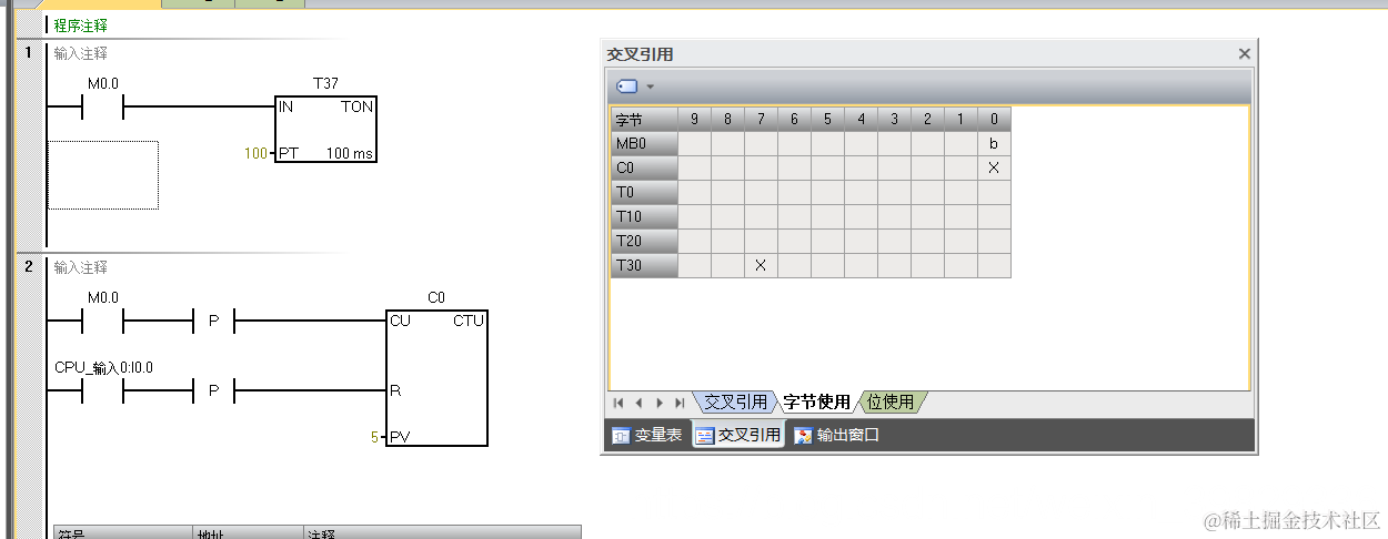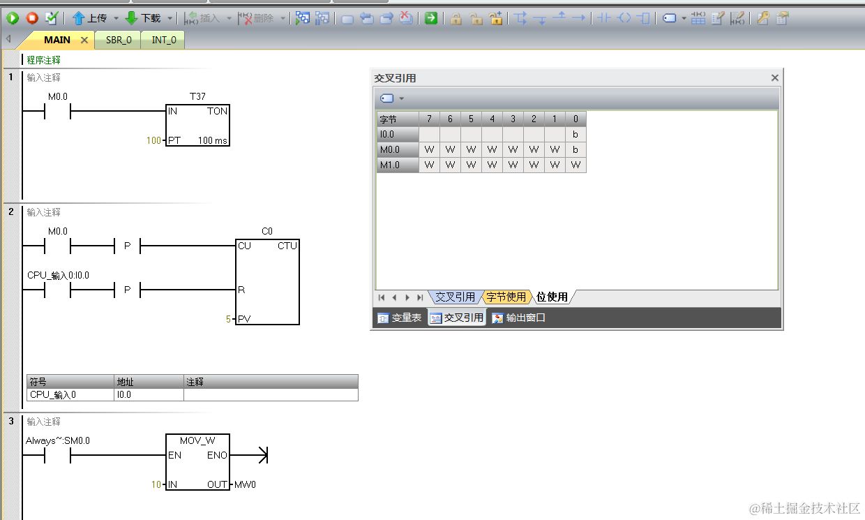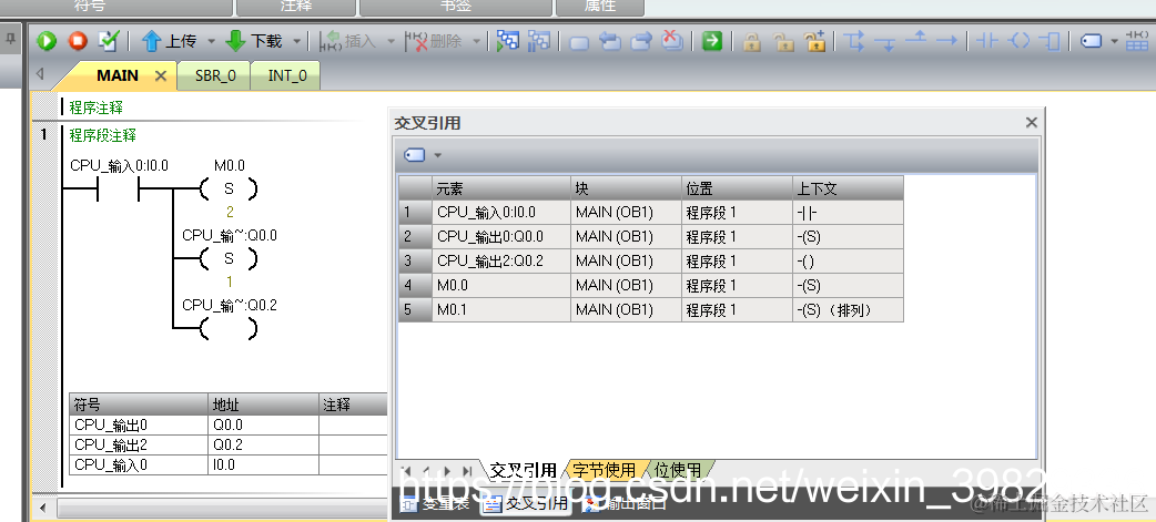 如上图中,交叉引用中显示了,程序中使用了I0.0,并且I0.0位于主程序块程序段1中,而且使用的是常开点;