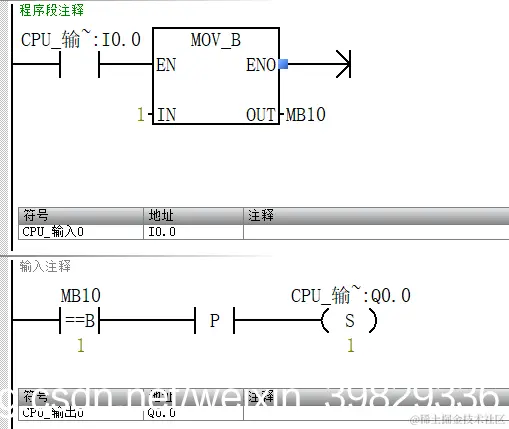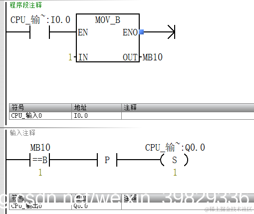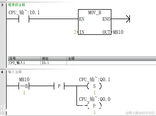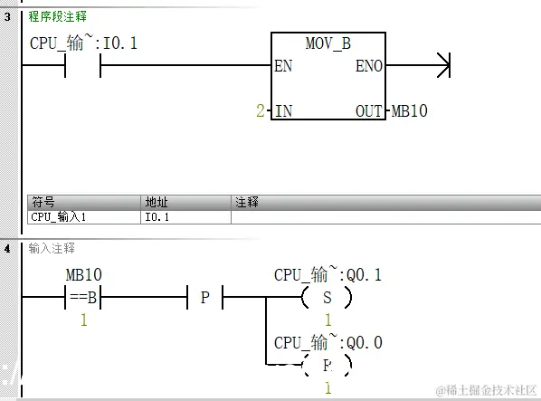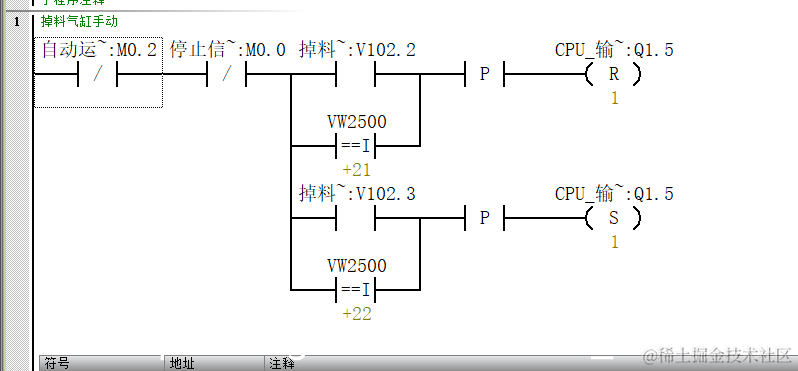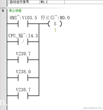 下图是一段顺序顺序控制逻辑,大部分初学者写代码,习惯第一步set个M0.0,第二步set个m0.1然后reset m0.0这样一直写下去,会浪费掉很多个M地址,导致复位什么都比较麻烦,一旦忘记一个M地址位,可能就会导致程序异常,如果我们换成使用赋值的形式,那么复位只需要将状态MB10赋值0即可