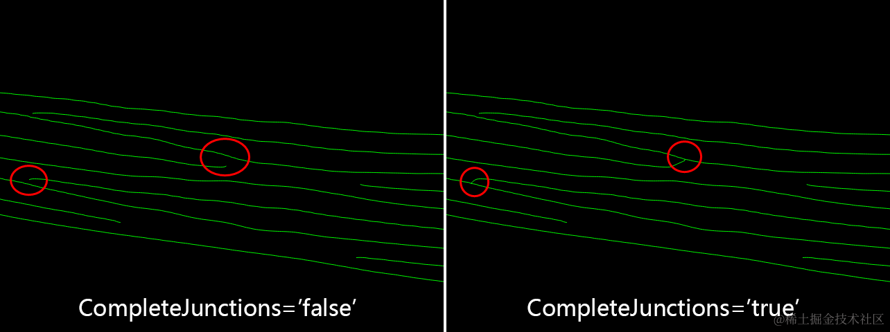 下面研究一下CompleteJunctions参数的意思。它可取的值有true或者false。该参数的意思为:是否应该在无法提取的地方添加连接点?