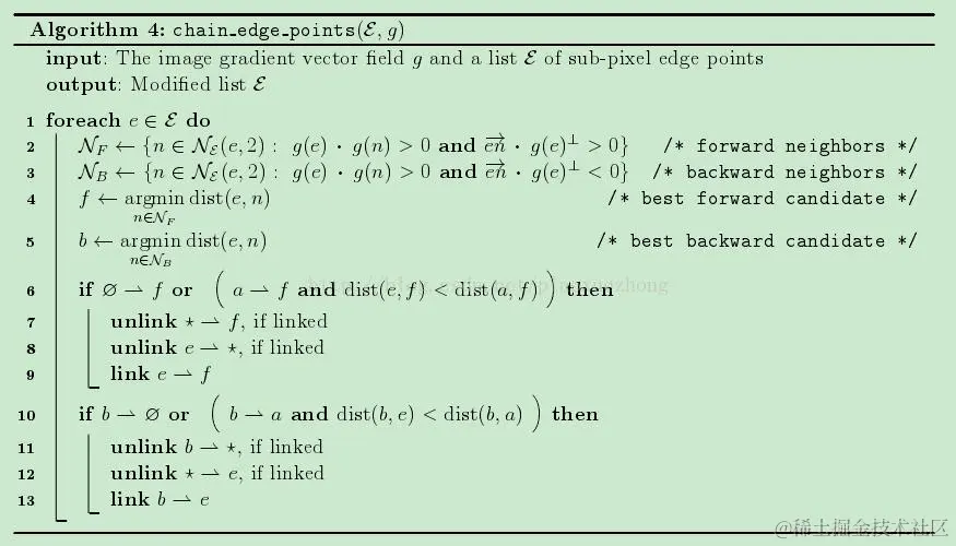 可以发现,当某一点的水平方向和垂直方向梯度值相等时,该点可以被归为任意方向上的边缘,不影响结果。最后,边缘点链路编码过程算法4,如下图12所示: