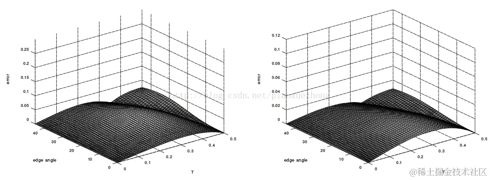 当γ=0时,误差为0,因为此时边缘在网格中间位置;当γ=0.5时,误差也为0,因为此时a=b或b=c,二次曲线插补值可以给出正确的偏移;σ越小,边缘越锐利,而σ越大,边缘越模糊,误差反而越小。