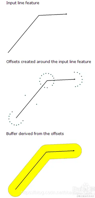 基本思想:即“简单平行线法”,在轴线的两边作出平行线,在转角处形成尖角,两端形成弧段,组成缓冲区。