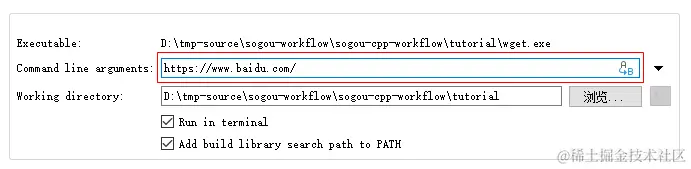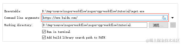 4、以Qt Creator打开tutorial-01-wget案例为例,添加命令行参数:
