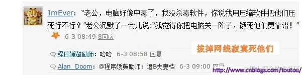 在上一篇(博客园的神回复,一起看看那些IT男的神回复[连载][一])中(ps: 这篇博客之所以改名是因为这次的神回复里有程序媛,所以用IT男不太合适),博客园神回复还是挺受欢迎的,上一篇博客的神回复取材均来自博问区,在这篇博客中,应了上一篇博客园友的强烈推荐(在这里也感谢rsync和_nil两位园友的推荐),在闪存中逛了好几遍,引入了闪存的一些神回复。当然,毕竟我不是所有的时间都focus在收集这个上面,而且这种类型的博客也没什么技术含量,所以也只是平常自己在闲逛的过程中收集一部分,图大家一乐,缓解一下紧张的工作和学习压力而已。如果大家在平常类似的神回复,可以@我,可以自荐或者他荐。