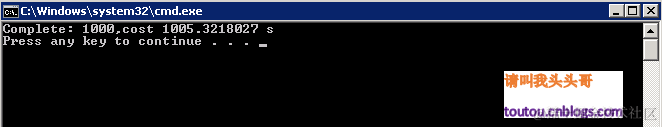 //------------------------------------------------------------------------------ // <copyright file="Runner.cs" company="CNBlogs Corporation" owner="请叫我头头哥"> // Copyright (C) 2015-2016 All Rights Reserved // 原博文地址: http://www.cnblogs.com/toutou/ // </copyright> //------------------------------------------------------------------------------ namespace CNBlogs.EmulationSystem { using System; using System.Collections.Generic; using System.Threading; using System.Threading.Tasks; using CNBlogs.Common.Shared; class Runner { /// <summary> /// Job helper /// </summary> private static JobHelper jobHelper = new JobHelper(); /// <summary> /// Runner lock /// </summary> private static Mutex mutex; static void Main(string[] args) { // 记录开始处理的时间 DateTime paddingTime = DateTime.Now.ToLocalTime(); int orderCount = jobHelper.GetJobCount(); // 用一个指示调用线程是否应拥有互斥体的初始所属权的布尔值来初始化 Mutex 类的新实例。 // 当前进程只能启动一次 mutex = new Mutex(false, "CNBlogs.EmulationSystem"); if (!mutex.WaitOne(0, false)) { Console.Out.WriteLine("Monitor already running..."); return; } var taskList = new List<Task>(); for (int i = 0; i < orderCount; i++) { int temp=i; taskList.Add(Task.Factory.StartNew(() => { // 假设i就是job id jobHelper.SubmitJob(temp); })); } // 等待所有task执行完毕 Task.WaitAll(taskList.ToArray()); // 记录处理完成的时间 DateTime completeTime = DateTime.Now.ToLocalTime(); var minutes = (completeTime - paddingTime).TotalSeconds; Console.WriteLine(string.Format("Complete: {0},cost {1} s", orderCount, minutes)); } } }代码效果:
