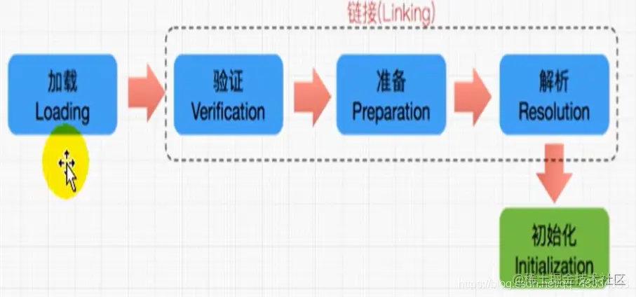 - 解析:将常量池内的符号引用转换为直接引用的过程;事实上,解析操作往往会伴随着JVM在执行完初始化之