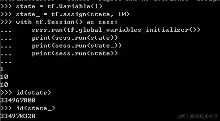 我们将10赋值给state,然后新建了一个变量state_。state是一个变量,这样是没有问题的,这样的话在训练的过程中我们就可以不断地更新参数了。 再看一个例子: