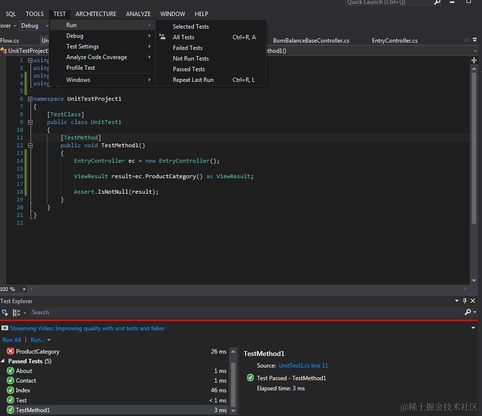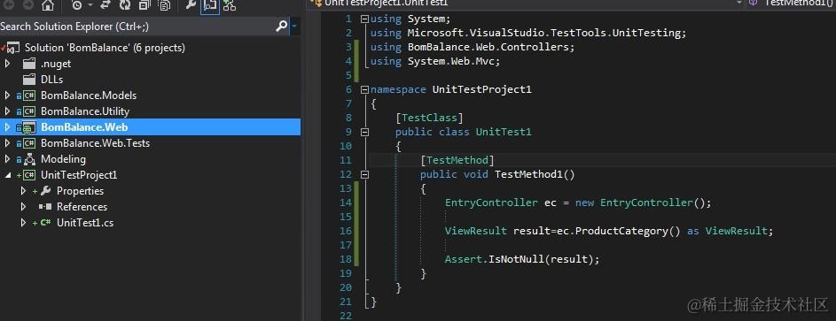 3.在测试方法中(此处为默认的TestMethod1,一般修改为 需要测试的方法名+Test )添加自己需要测试的代码。不过在此之前,首先要引用需要测试的项目以及需要用到的类库。 此例中,我引用了微软的MVC4.0框架,以及需要测试的项目中的Controller。在此我测试该Controller的ProductCategories()方法。该方法返回一个ActionResult。测试代码中有3行,第一行用来实例化controller,第二行调用controller的方法。如果仅以该2行进行测试通过,则说明代码无语法问题,可以和其他各部分配合工作。第三行用了一个断言来检测方法返回的result是否为空。此处我断言它非空,如果为空,测试将会失败报错。