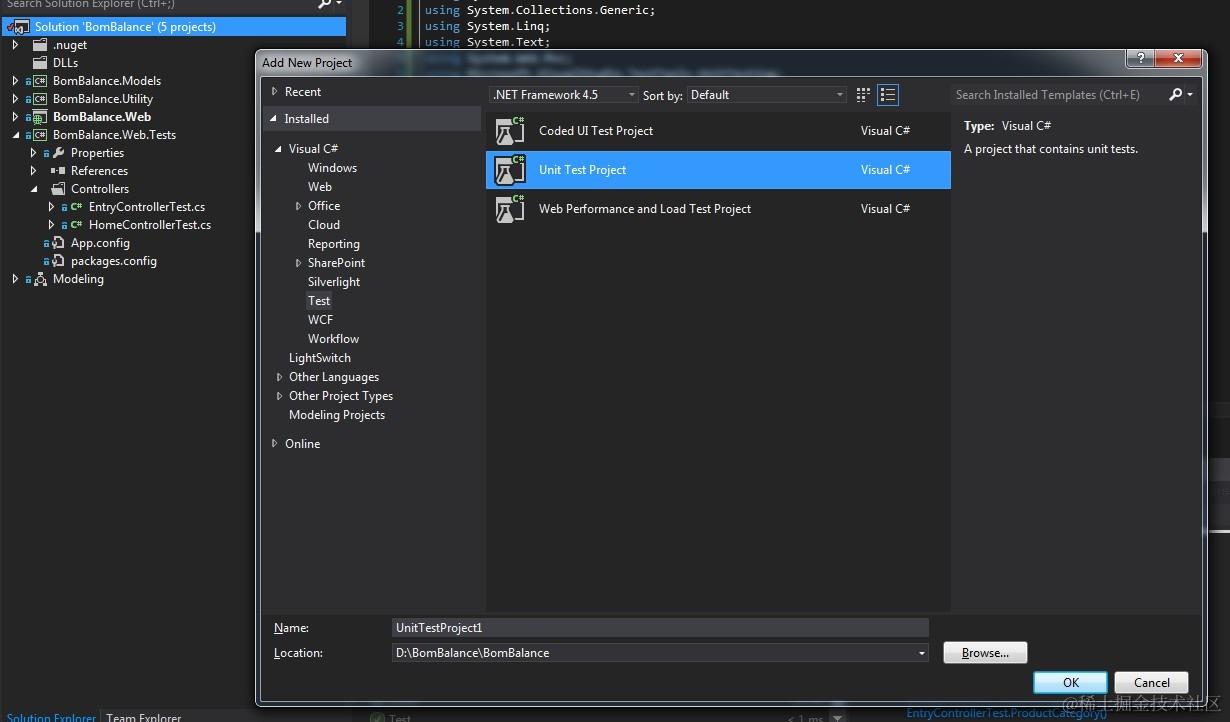 1.首先,右键点击解决方案(Solution)弹出右键菜单(Context)。选择添加(Add) - 新项目(New Project), 在给出的模版中,选择 Visual C# - Test -Unit Test Project 如图。