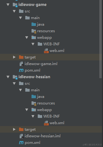 在 game, hessian, rms 模块的src目录下分别创建 webapp/WEB-INF 文件夹,并在该目录下添加web.xml(空文件即可)。完成后目录结构如下图: