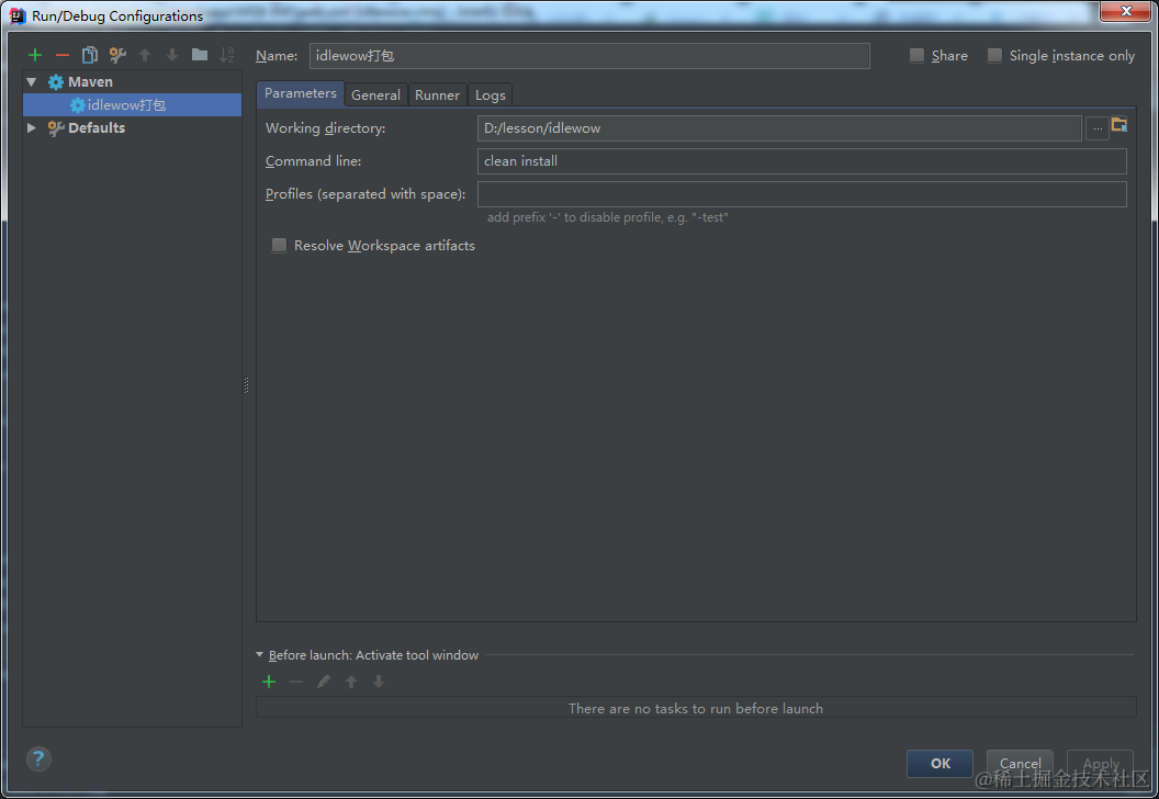 在左上角菜单选择 ” Run --> Edit Configurations "(快捷按钮里直接点也可以),点击左上角绿色的加号,选择Maven(代表使用maven命令或插件来编译、打包、启动项目)。然后填写名称 "idlewow打包",选择根目录,填写执行命令"clean install",