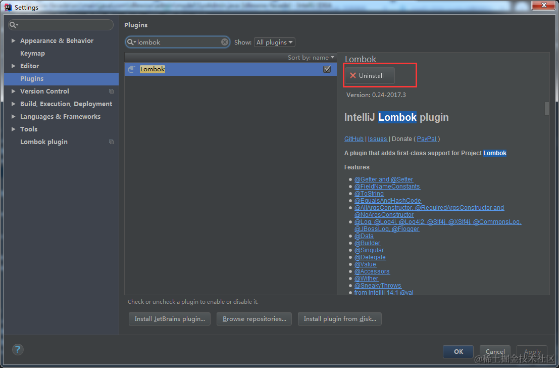 图中按钮是卸载,因为我这里已经提前安装好了。读者在安装后,IDE会提示重启生效。此时,重启IDEA即可开始使用。