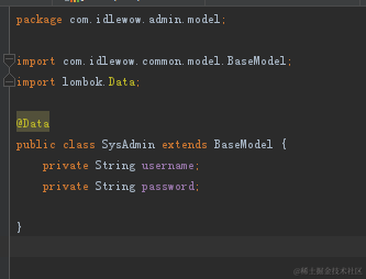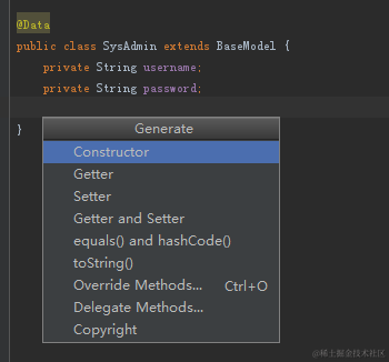 在模型类上,添加注解 @Data,即可省去手写getter, setter, toString的麻烦,如下图: