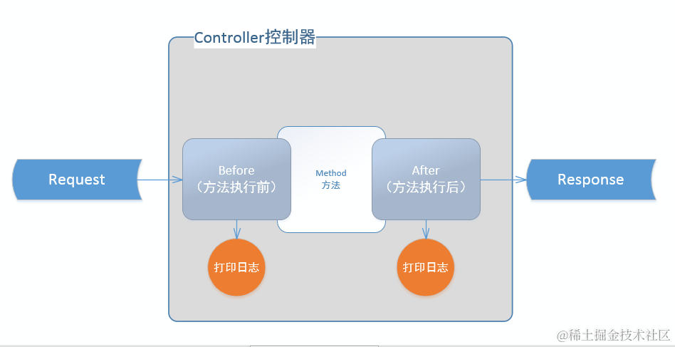 上一章,我们初步实现了后台管理系统的增删查改功能。然而还有很多功能不完善。这一章,我们先把系统日志搭建起来,不管是生产问题排查,还是方便开发调试,日志都是必不可少的核心功能。所谓切面日志,比如说,我们想把每个方法的入参都记录日志,那需要在每个方法里都写一行记录参数的语句,非常繁琐。所以需要提取出切面“方法执行前”,“方法执行后”等等,然后在这个切面里进行编程,记录入参的语句只需要写一次。整体的流程大致如下图: