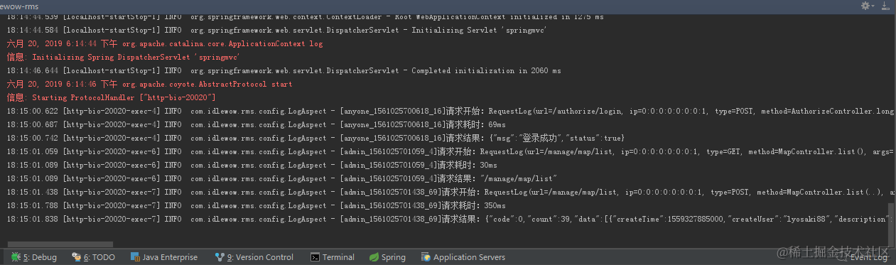 在这个配置文件中,我们定义了日志存放路径"/logs/idlewow-rms/",windows下默认D盘。控制台的日志输出格式,以及3个级别INFO, WARN, ERROR的文件输出方式。同时把spring组件的日志级别提高到info,过滤掉debug信息。