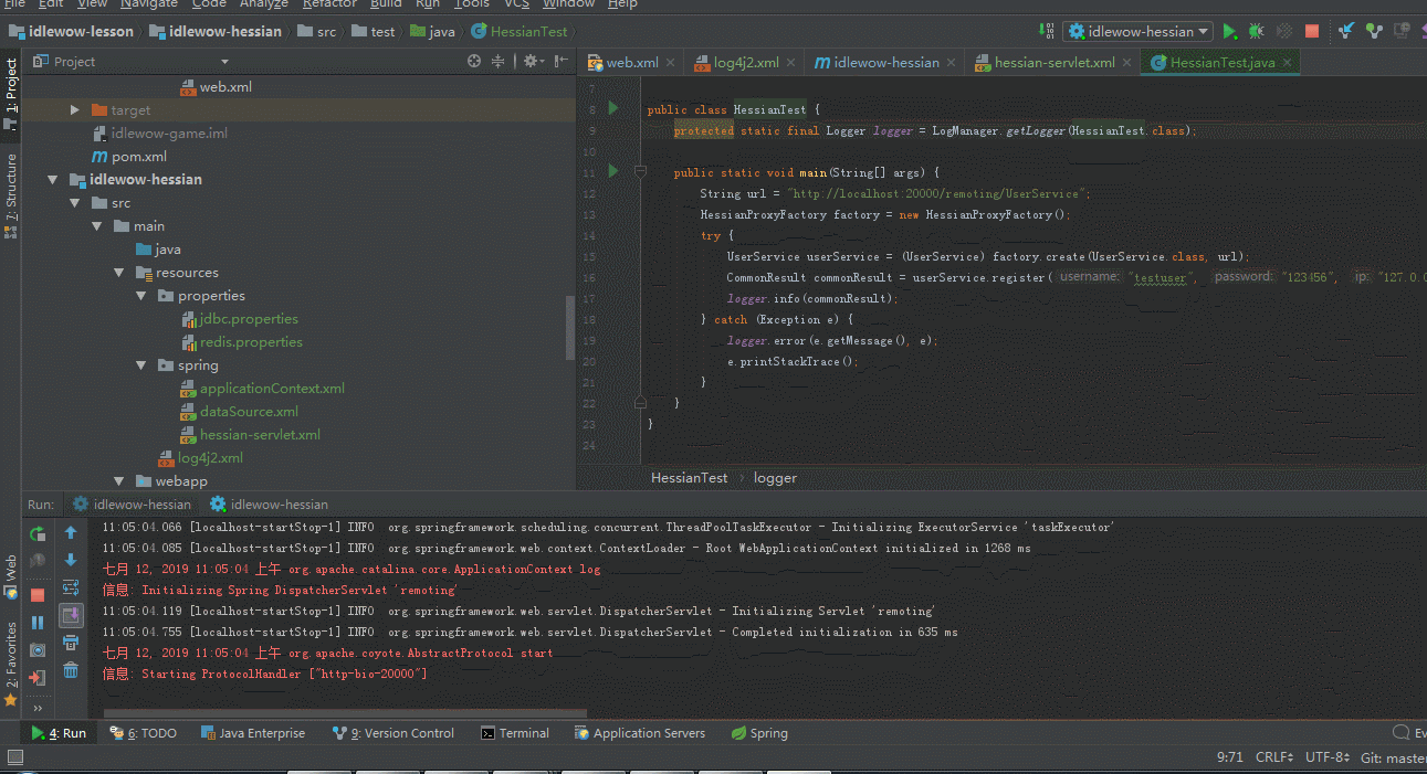 在game模块中调用hessian时,也是通过在xml中配置注入的方式调用。这里我们还没开始写game模块,为了测试,先简单写一个入口类(即带main函数的类)调用。类似于C#中写控制台程序调用。
