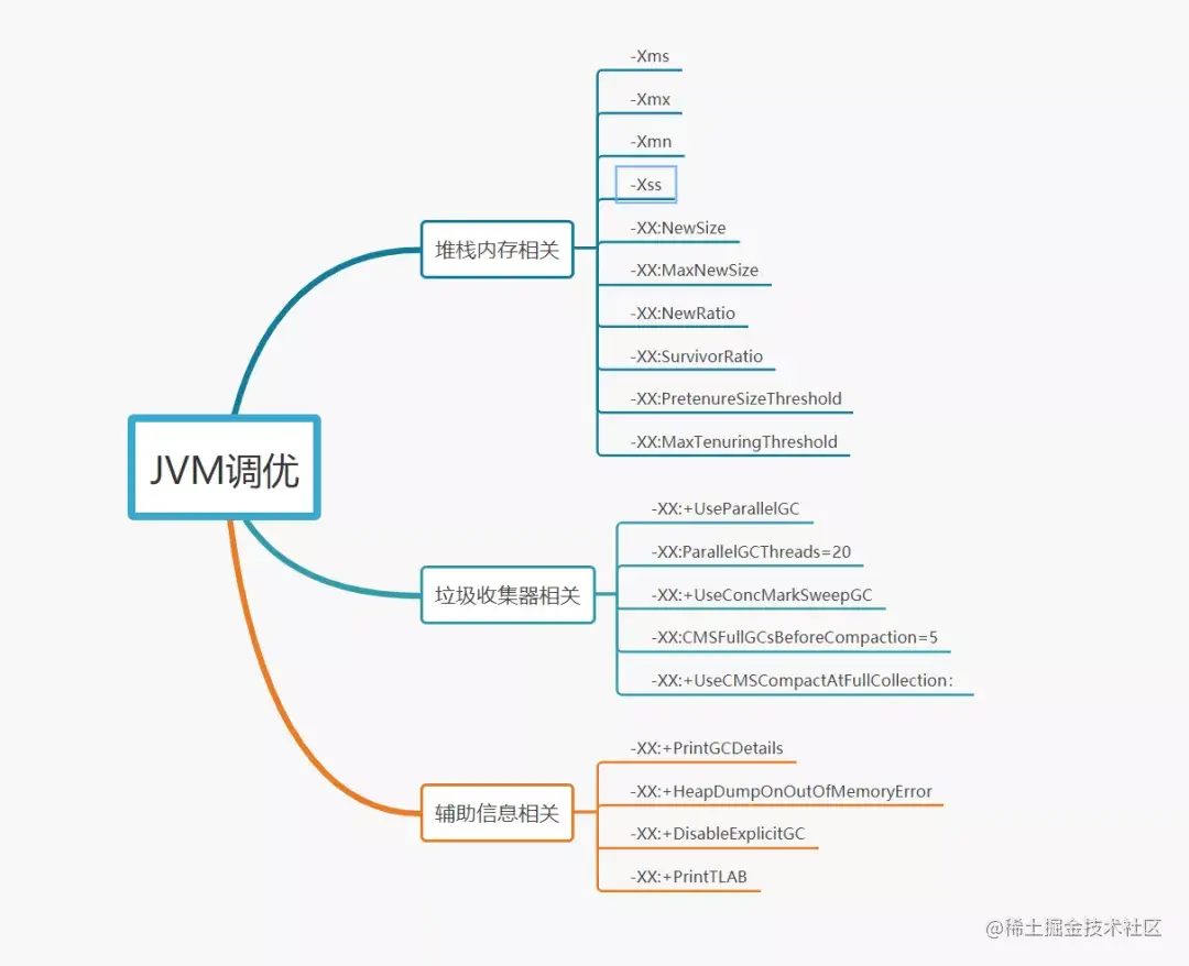 ❝-Xms 设置初始堆的大小-Xmx 设置最大堆的大小-Xmn 设置年轻代大小,相当于同时配置-XX:NewSize和-XX:MaxNewSize为一样的值-Xss 每个线程的堆栈大小-XX:NewSize 设置年轻代大小(for 1.3/1.4)-XX:MaxNewSize 年轻代最大值(for 1.3/1.4)-XX:NewRatio 年轻代与年老代的比值(除去持久代)-XX:SurvivorRatio Eden区与Survivor区的的比值 -XX:PretenureSizeThreshold 当创建的对象超过指定大小时,直接把对象分配在老年代。-XX:MaxTenuringThreshold设定对象在Survivor复制的最大年龄阈值,超过阈值转移到老年代❞