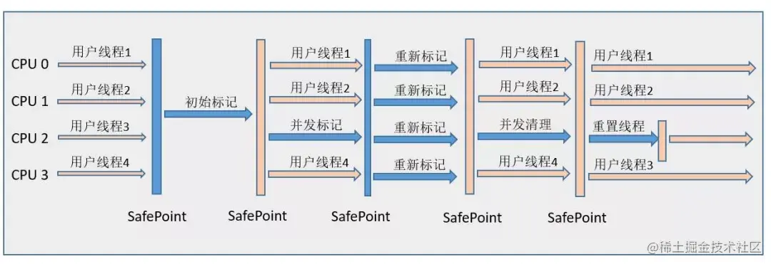 这些位置就叫作**「安全点(safepoint)。」** 用户程序执行时并非在代码指令流的任意位置都能够在停顿下来开始垃圾收集,而是必须是执行到安全点才能够暂停。