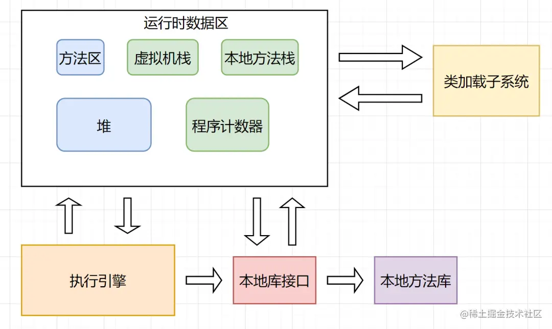 ❝Class loader(类装载子系统)Execution engine(执行引擎子系统);Runtime data area(运行时数据区组件)Native Interface(本地接口组件)。❞