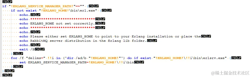 这里查看系统环境变量,ERLANG_HOME已经正确配置了。只好打开rabbitmq-service.bat脚本查看,搜索这段提示文字,找到如下代码: