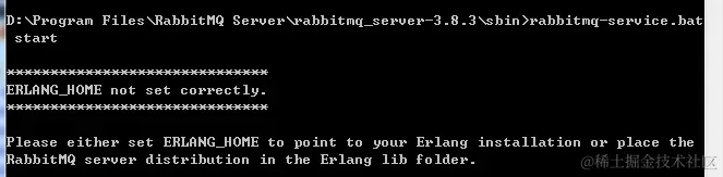 我这里直接启动快捷方式,或者在sbin目录下执行rabbitmq-service start(或install)指令来启动(或安装)服务,都会出现如下提示:ERLANG_HOME not set correctly。