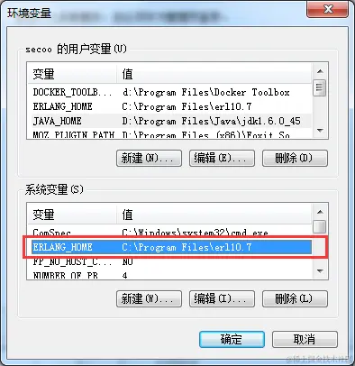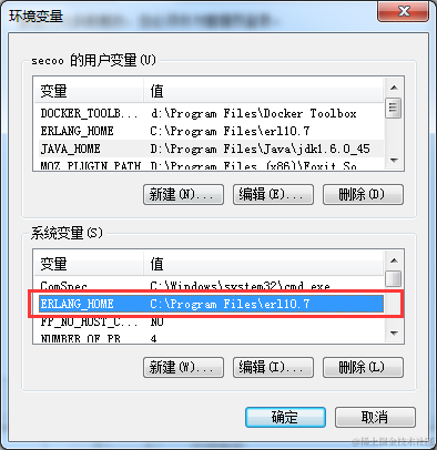注意:Erlang安装成功后,会注册一个环境变量,如下图。