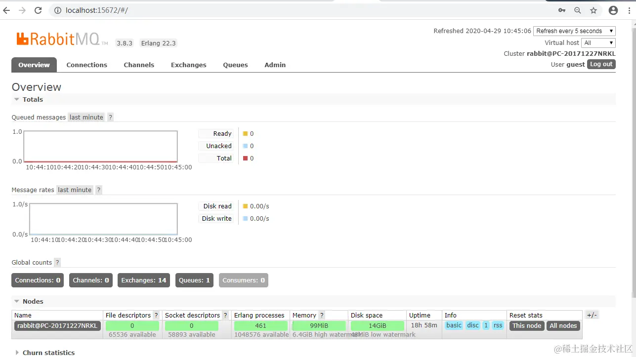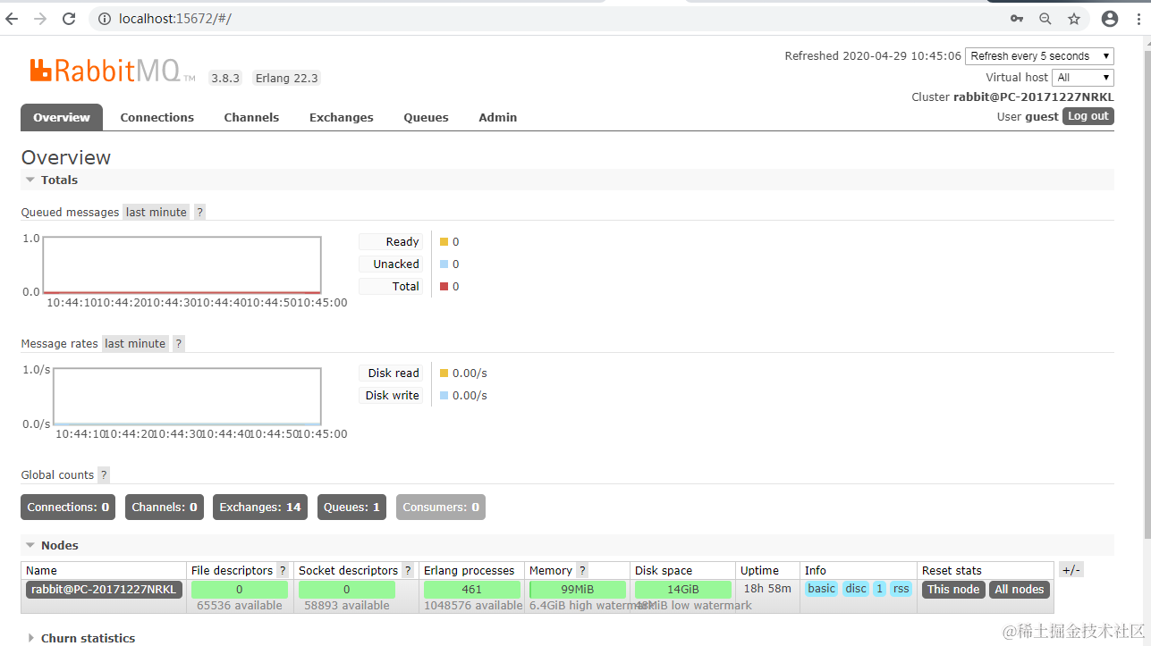 安装成功后,访问 localhost:15672/#/ 即可,默认用户名和密码都是guest