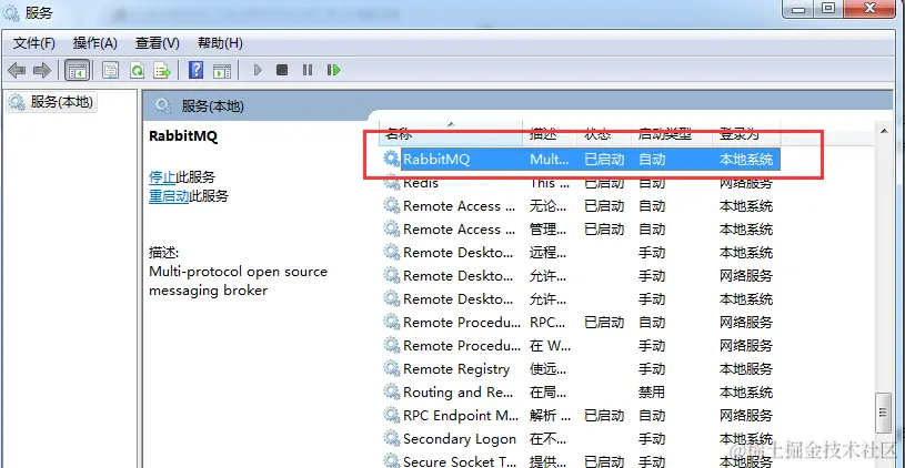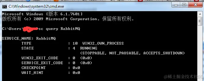 或者WIN+R, 输入cmd,执行指令sc query RabbitMQ,也看查看服务状态。