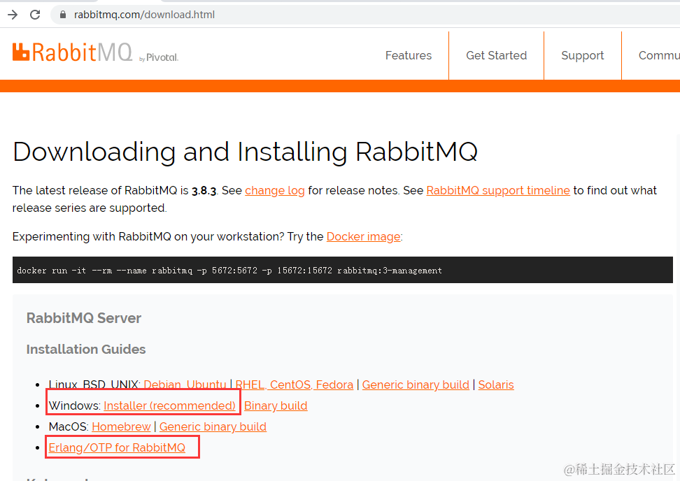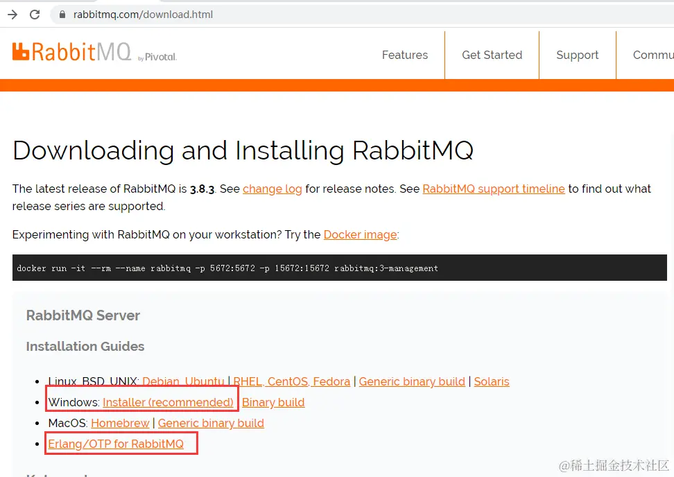 因为RabbitMQ是Erlang编写,安装时,需要先安装Erlang。在RabbitMQ官网(www.rabbitmq.com/download.ht…)提供了Erlang下载(如下图红框内),也可以到Erlang官网下载最新版。我这里下载的都是windows 64位安装包(installer版本)。