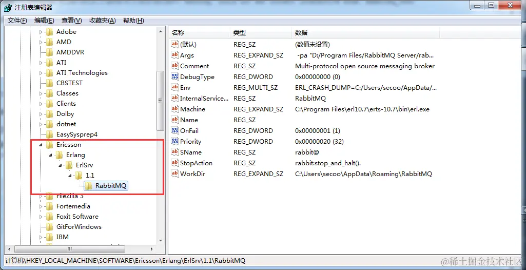 WIN+R,输入 regedit 打开注册表。找到路径HKEY_LOCAL_MACHINE / SOFTWARE / Ericsson / Erlang / ErlSrv / 1.1 / RabbitMQ ,删除即可。