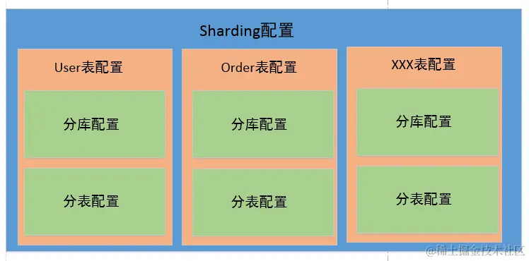 简单的理解如下图,对sharding-jdbc进行配置,其实就是对所有需要进行分片的表进行配置。对表的配置,则主要是对分库的配置和分表的配置。这里可以只分库不分表,或者只分表不分库,或者同时包含分库和分表逻辑。