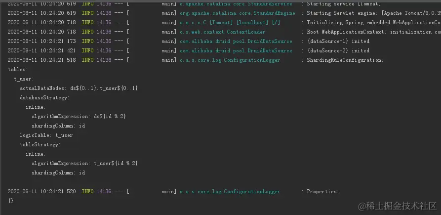项目启动后,sharding日志会将配置已 yml 格式的形式打印出来,也可以省去 java 配置,将其优化到 .yml 配置文件中去,如下图: