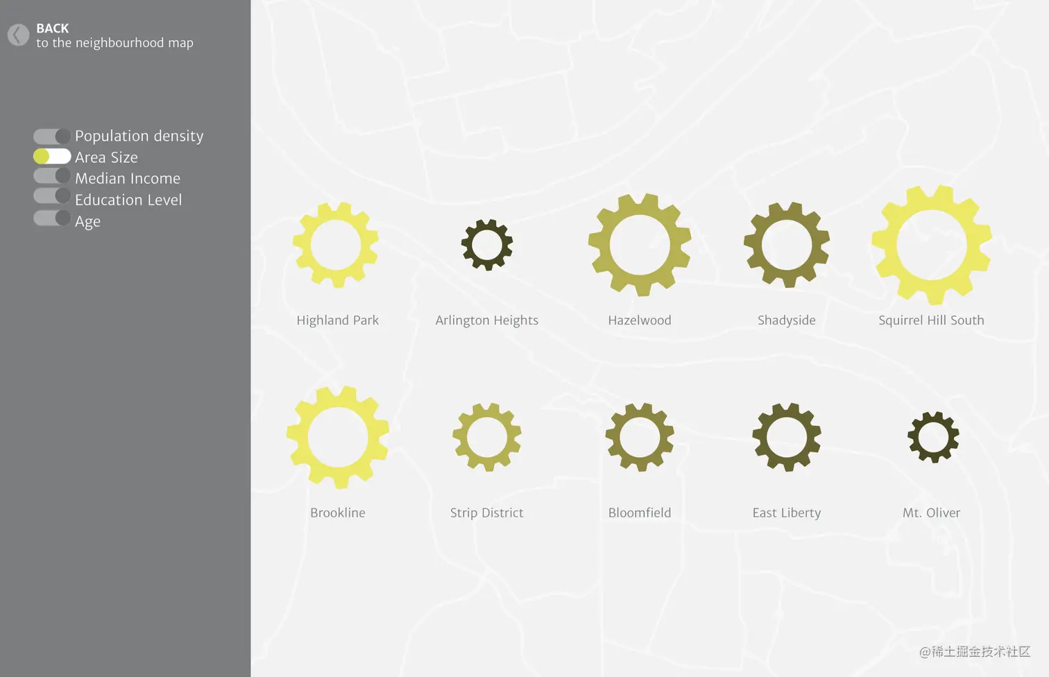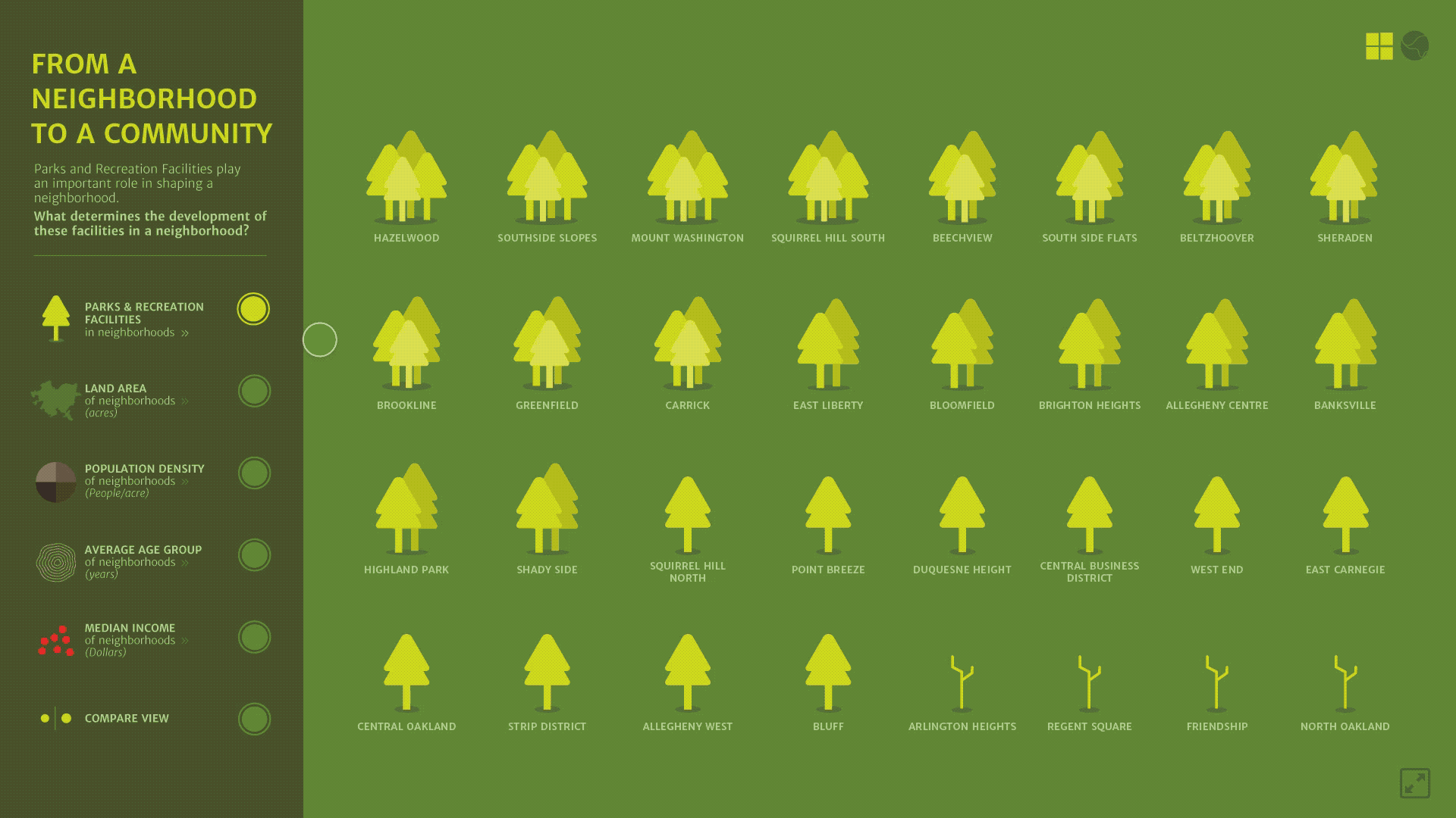 可视化的目的是调查城市基础设施和社区人口构成之间的关系,如果有的话,并以人们可以参与的方式呈现。