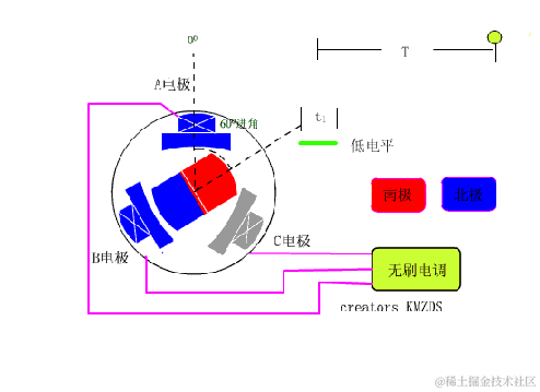 直流无刷电机如下图所示,没有电刷和换相机构,主要靠无刷控制器,控制三个定子的通电顺序来控制转子的转动;