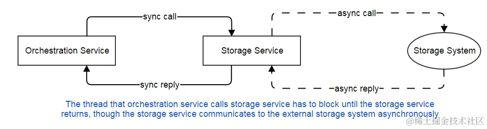 图:线程中,业务流程服务要调用存储服务,直到存储服务返回了,线程才能结束。 虽然,存储服务通过异步方式和外部存储系统交互。