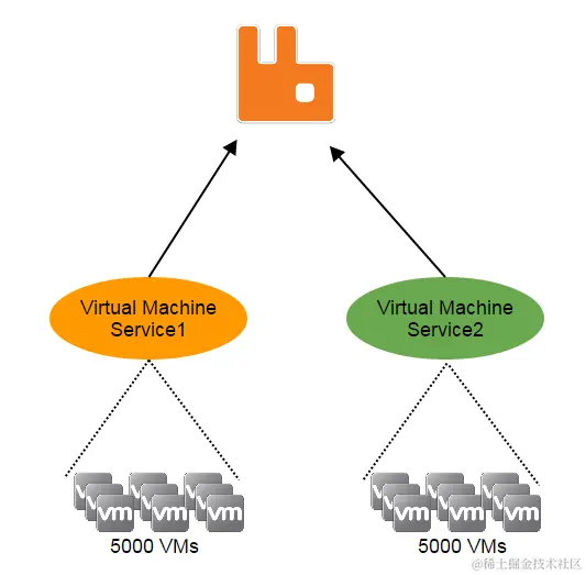 由于无状态服务是保证整个系统无状态的根基,在讨论它是什么之前,让我们先了解下什么是“状态”。在ZStack里面,资源,如主机,虚拟机,镜像,以及用户,都是由单个服务管理的;当系统中存在多余一个服务实例的时候,资源会被划分为不同的实例。例如,假如有10,000个虚拟机和两个虚拟机服务实例,理想的情况下,每个实例将会管理5000个虚拟机: