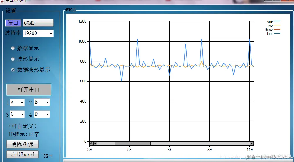主程序中循环读取AD口的采样值,并将采样值通过中位值平均滤波算法进行滤波,通过串口分别打印原始采样值和滤波后的值,并通过串口将数据打印来,并在串口波形软件上显示。