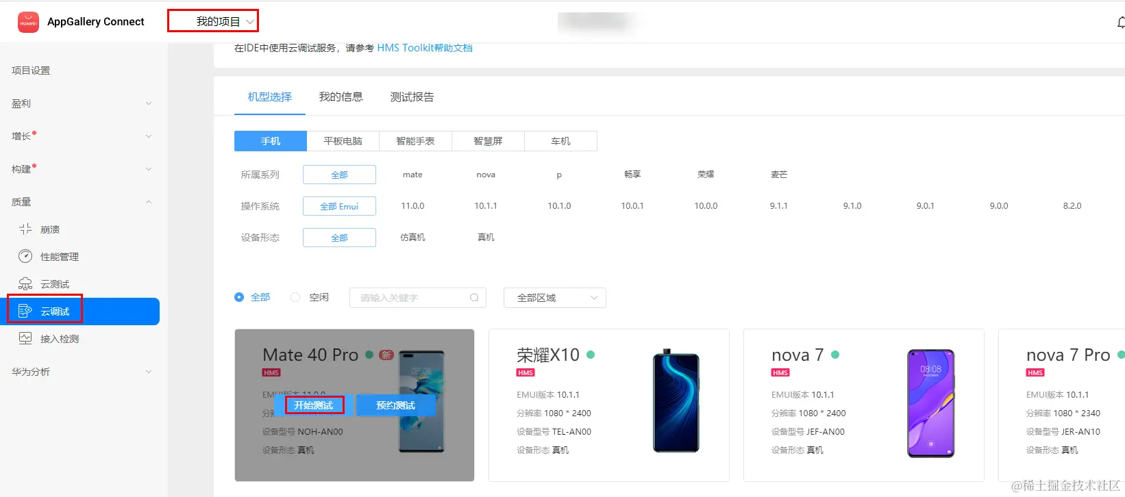 2、在AGC界面 – 我的项目 – 随便选择一个项目 – 在左侧导航栏选择“质量-云调试”。