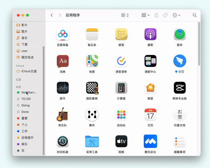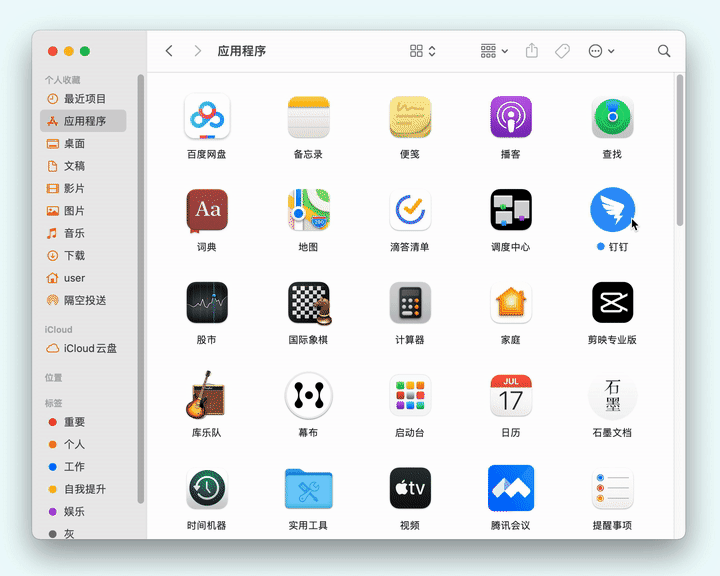 你甚至还可以把应用程序给分类了,比如万恶的【钉钉】就可以被标记成工作,不用一页页查找应用,避免漏看。当然这是个极端例子,因为只会在工作的时候用到钉钉。而大部分软件的应用场景非常丰富,并且利用 Mac 的【聚焦】搜索,默认快捷键【Command+空格键】,你同样能快速打开软件。