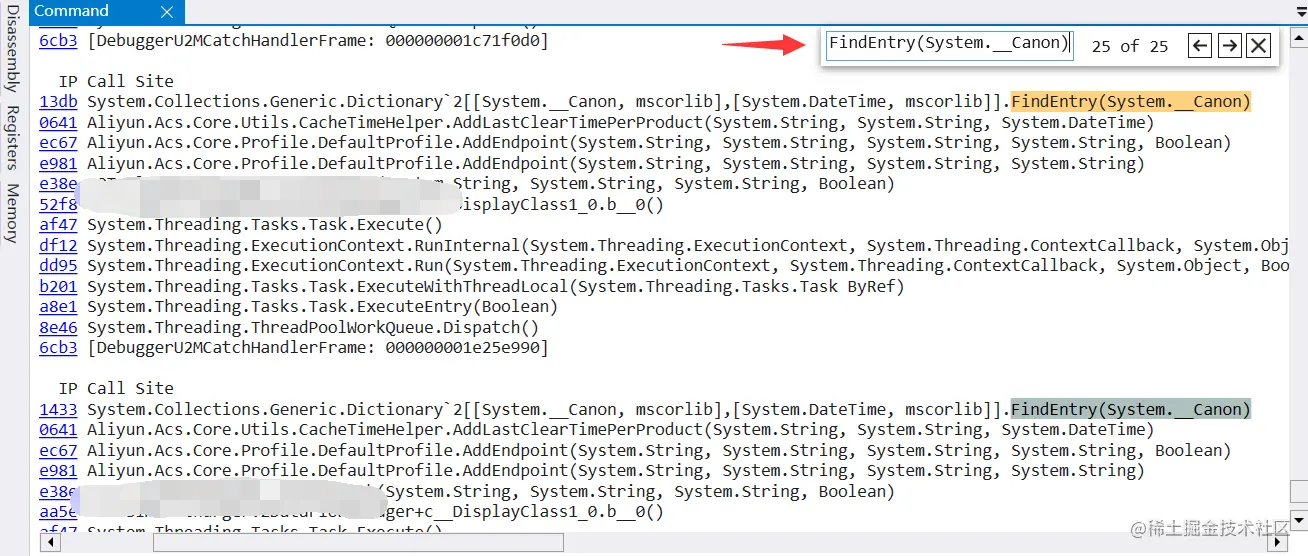 从图中可以看出当前有 25 个线程正卡在 FindEntry(System.__Canon) 处,而且从调用堆栈上看,貌似是 aliyun 封装的dll,为什么有这么多的线程卡在这里呢?这就给人一个很大的问号? 接下来我就把阿里云的这段代码给导出来看看到底发生了什么。