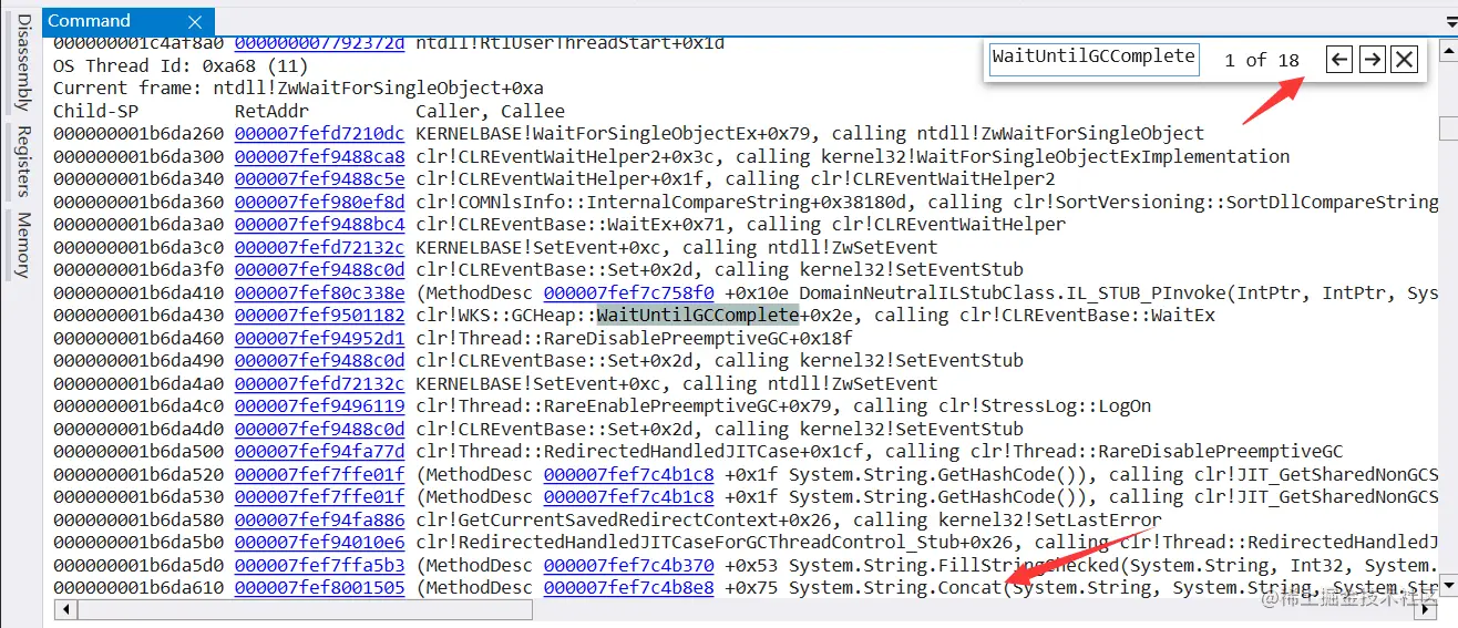 从图中看,嘿嘿,真的有18个线程在等待,而且还看到了 System.String.Concat ,是不是和我上上篇发的 his cpu爆高是一个套路?😘😘😘