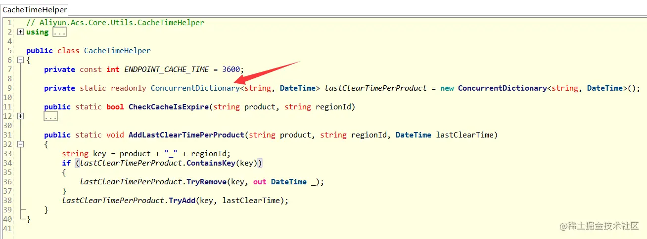 到这里,有没有看出这个 CacheTimeHelper 有什么问题吗? 对,竟然在多线程环境下用的是非线程安全的 Dictionary<string, DateTime>,这就很有问题了。