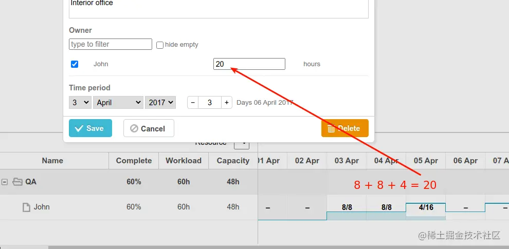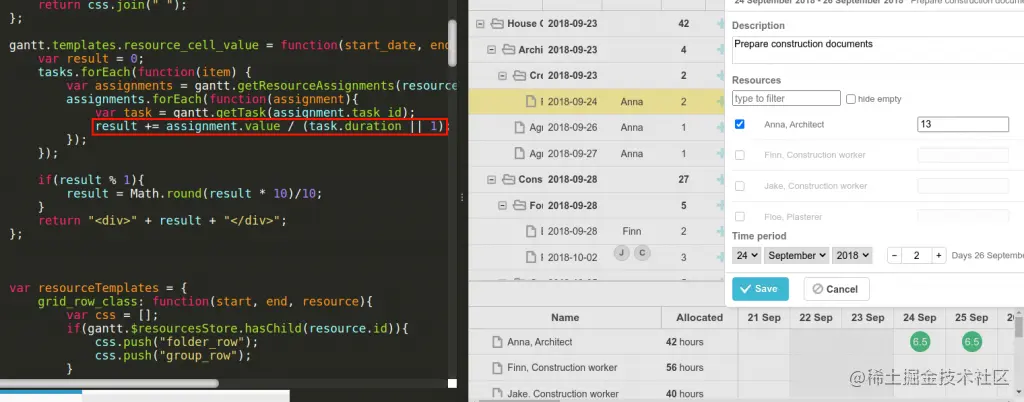 让我们使用此代码片段看一下它在实践中是如何工作的。在此示例中,Anna有13个小时来完成“准备施工文件”任务。任务持续时间为两天。因此,安娜每天可以花6.5个小时来完成这项任务,以便及时完成任务。您可以在resource_cell_value模板中指定这样的公式,然后应用它来更有效地分配工作负载。