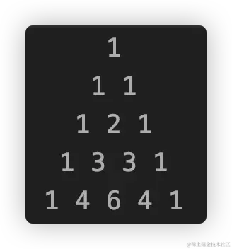 杨辉三角是一个很有趣的图形,一个金字塔的构图,顶部和两侧的值固定为1,此时你应该想到什么?没错,递归出口!其他部分的值为上一层中与它最邻近的两个值的加和,如:自顶向下(第4层,第3列),它的值为(第3层,第2列) + (第3层,第3列)。