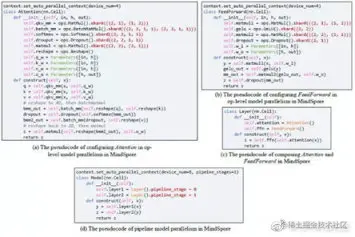 MindSpore 对外屏蔽了复杂并行实现的细节,使得用户像编写单机模型脚本那样简单。用户在单机脚本的基础上,仅通过少了配置就能实现多维度的混合并行。下图是简化版的盘古脚本,其中红色加粗字体表示的在 MindSpore 中的并行策略。将红色加粗字体去掉,则是单机脚本。