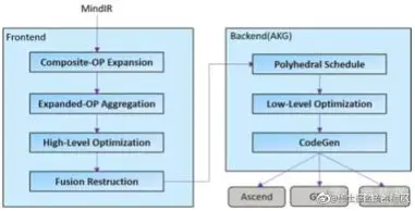 为了提升硬件利用率,MindSpore 使用了图算融合优化技术,通过图层和算子层联合优化,并将「用户使用角度的易用性算子」进行重组融合,然后转换为「硬件执行角度的高性能算子」,从而充分提升硬件资源利用率,进而提升整网执行性能。具体优化流程如下图所示: