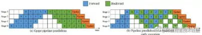 Pipeline 模型并行将模型的按层分成多个 stage,再把各个 sage 映射到多台设备上。为了提高设备资源的利用率,又将 mini-batch 划分成多个 micro-batch, 这样就能够使得不同设备在同一时刻处理不同 micro-batch 的数据。